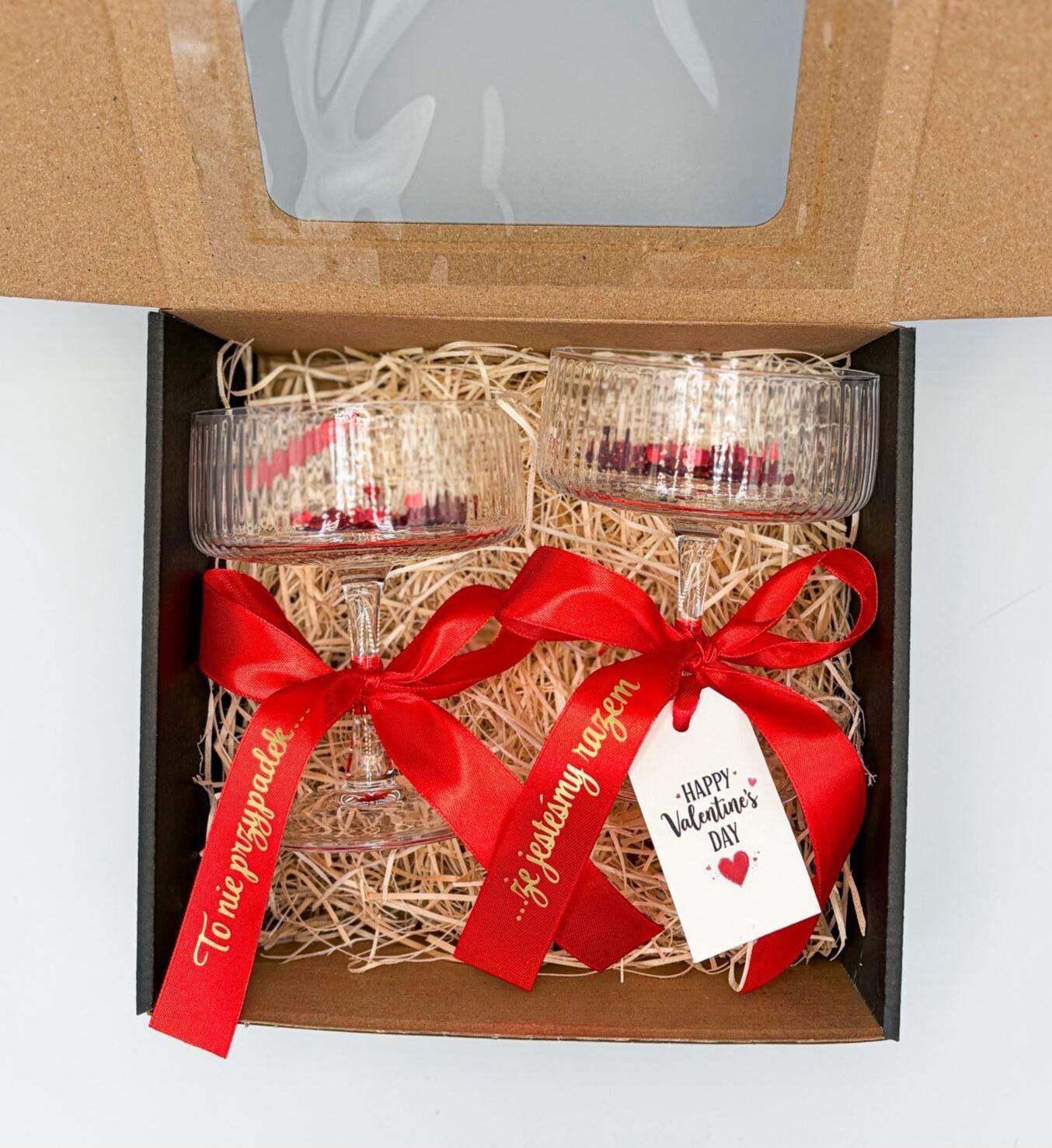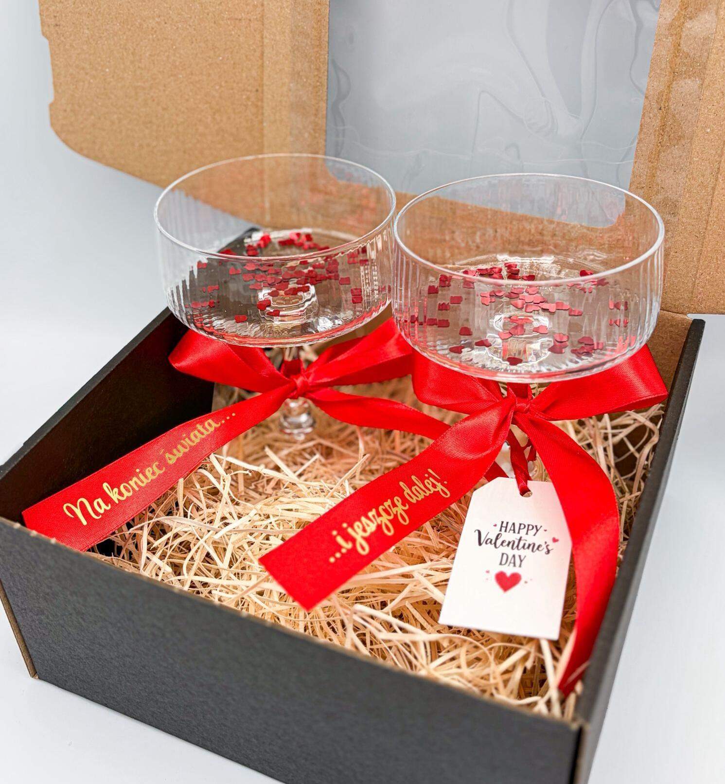 Box Walentynkowy z kieliszkami do szampana/prosecco dla zakochanej pary. Idealny na Walentynkową kolację w domu. Na czerownych wstążkach do wyboru 3 warianty napisów w eleganckim złotym kolorze.